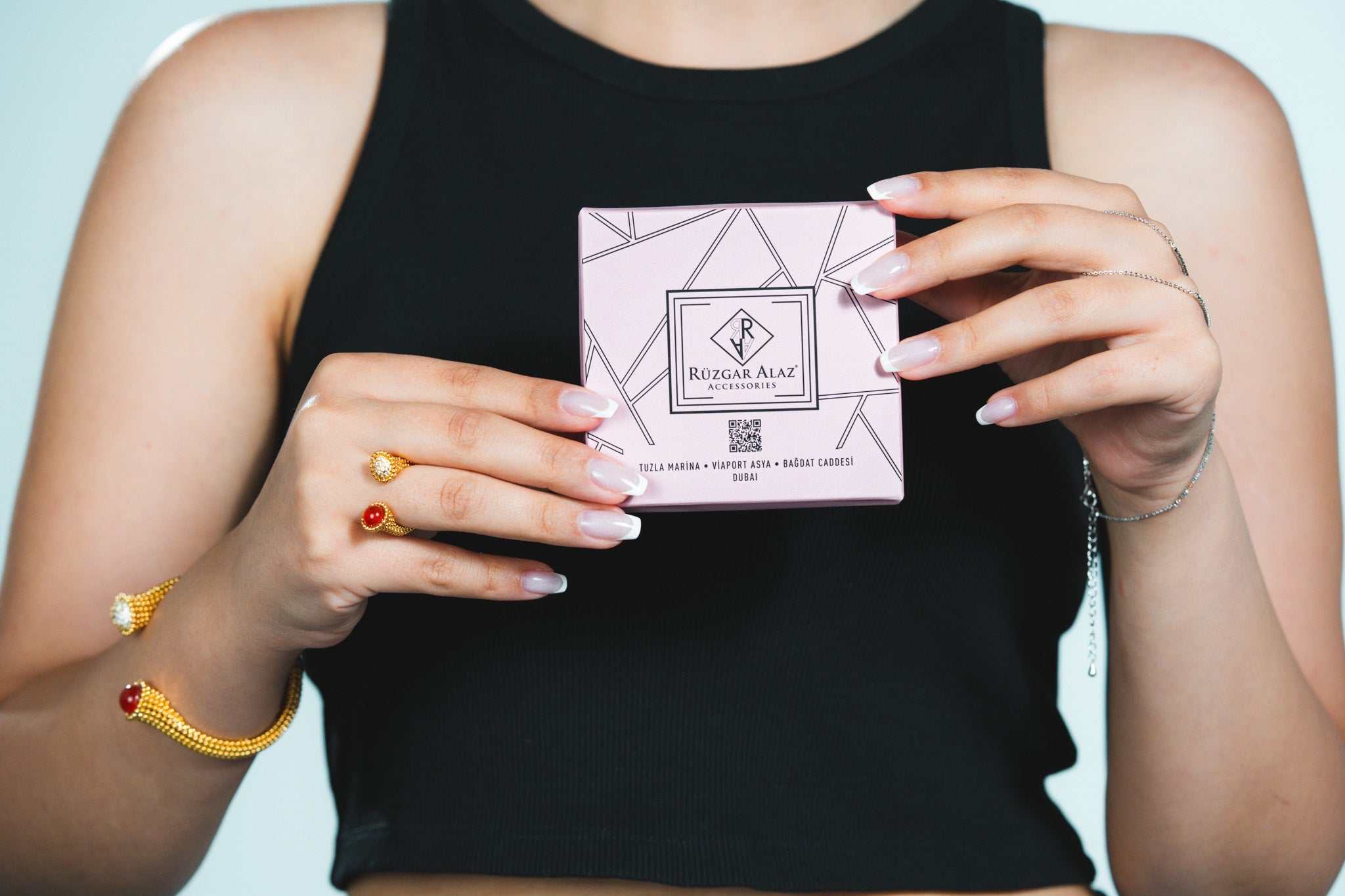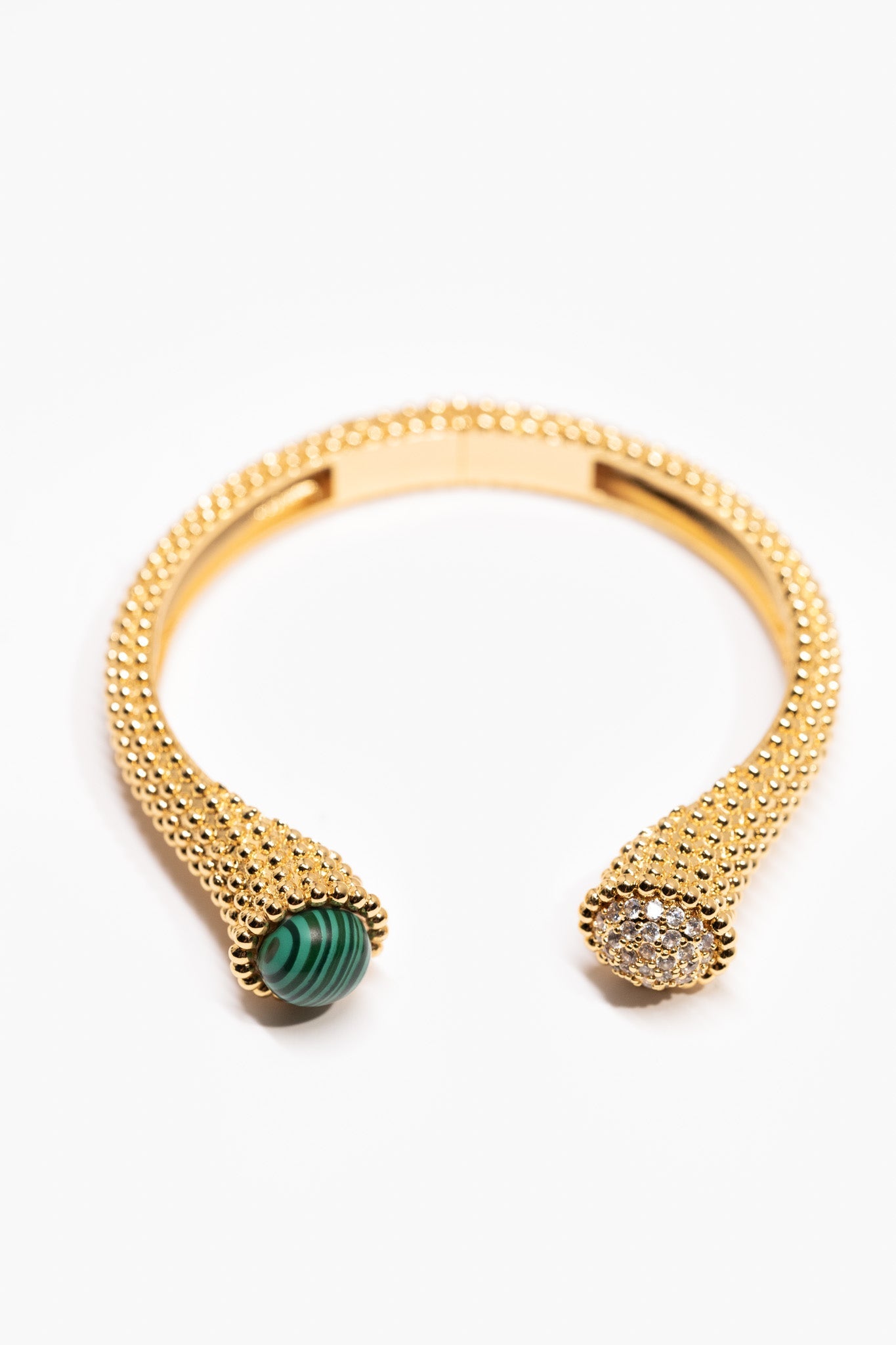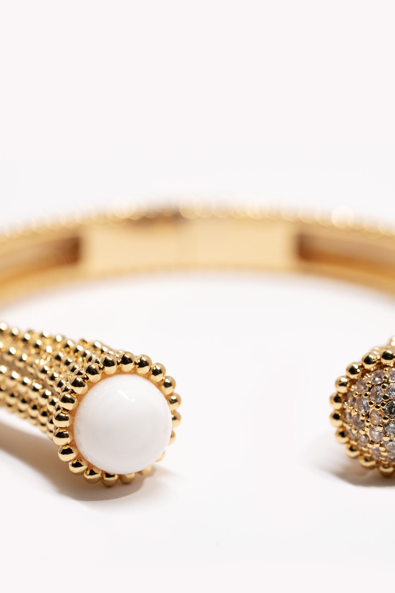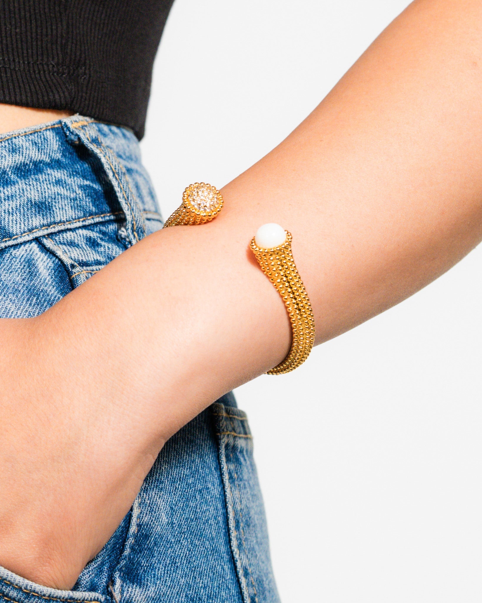 Perle Cuff offers a striking elegance with its two contrasting ends. The gold-toned textured surface appeals to both modern and traditional tastes. One end is adorned with a red pearl-like stone, while the other features sparkling white zircon details—adding a sophisticated touch to your style.