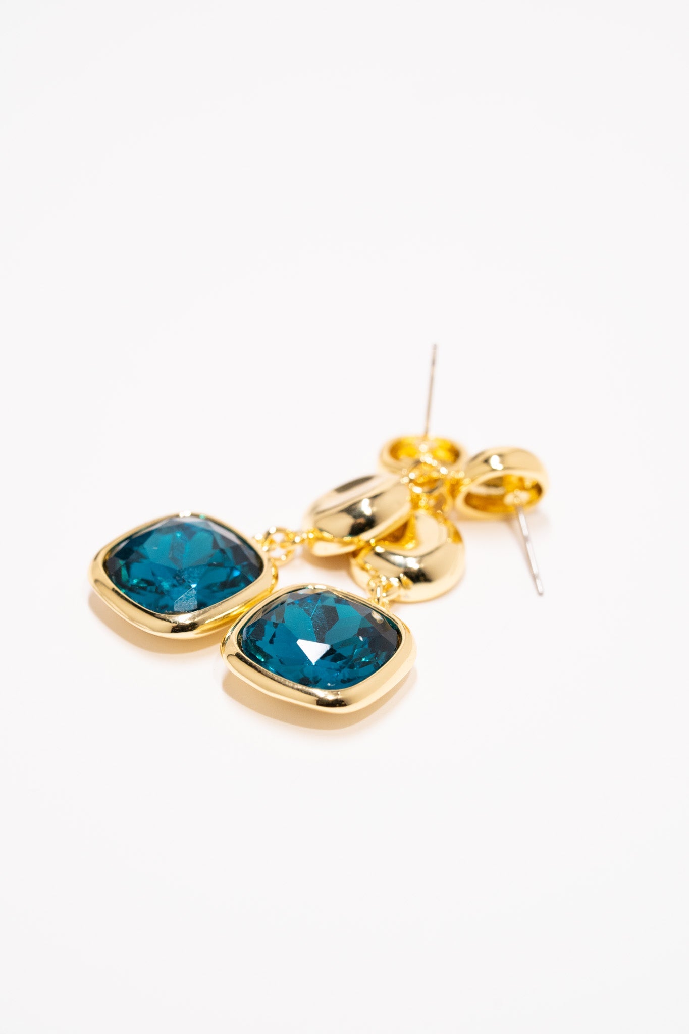 Pomel Drop Earrings feature a captivating design that blends classic and modern elegance with deep blue crystal stones paired with graceful hoops. The gold-plated body reflects light with finesse, while the square-cut blue stones add a sophisticated touch. Thanks to the triple articulated link system, the earrings sway gently with every movement.