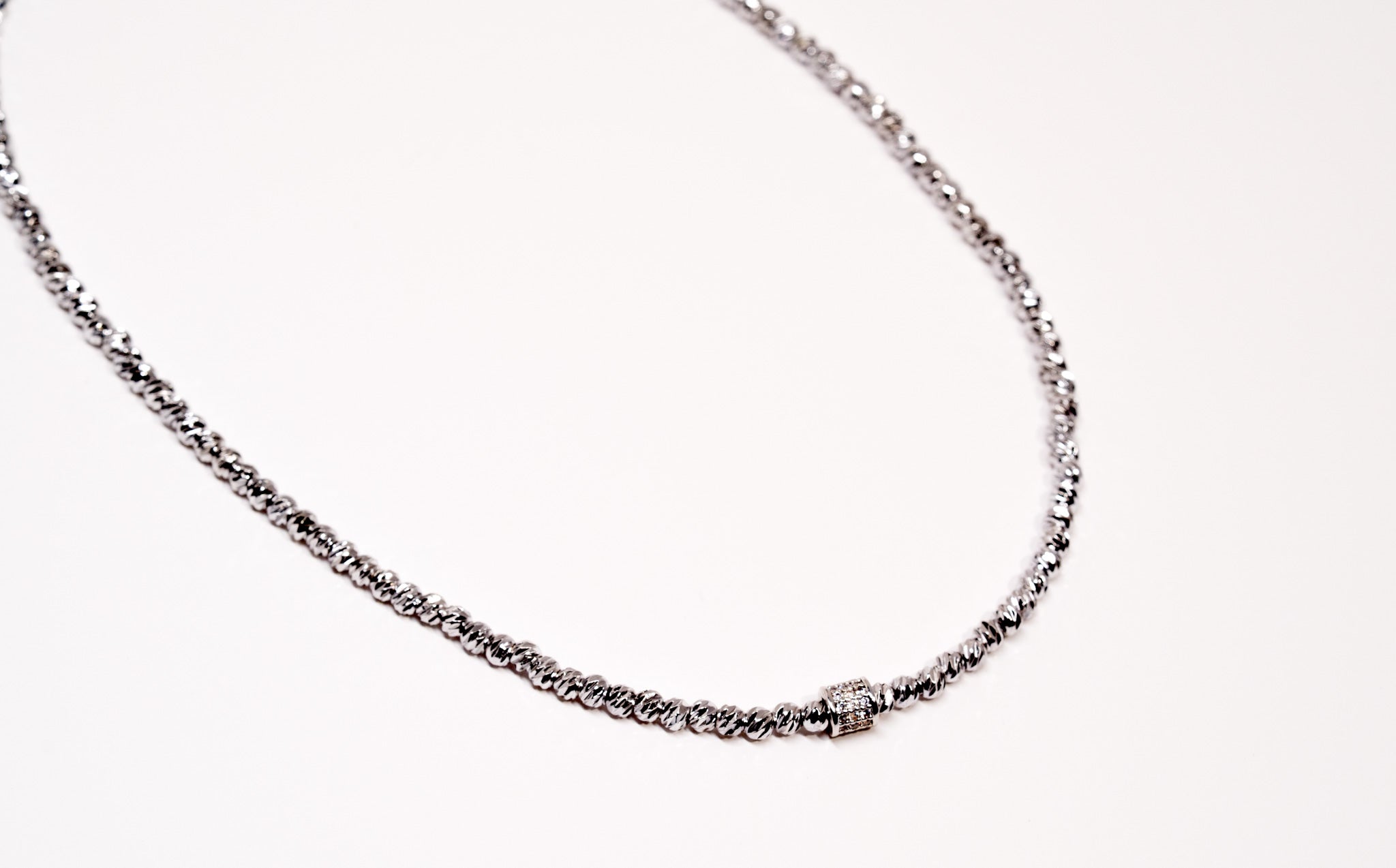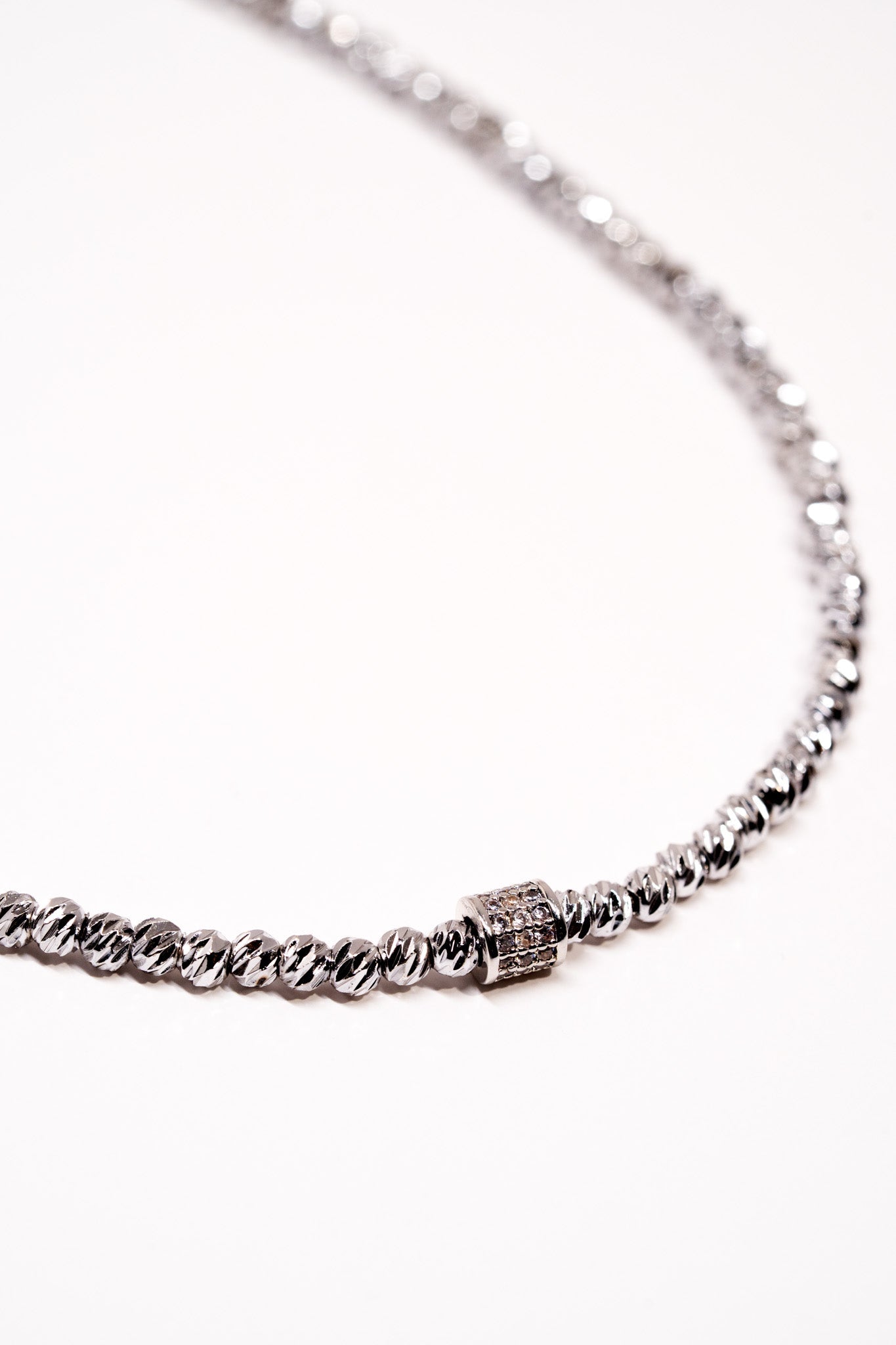 Dorika Necklace combines elegance and modern charm with its shimmering dorika beads and a stone-embellished cylindrical centerpiece. Designed with the brilliance of silver tones, this necklace is an ideal complement for both daily wear and special moments. Its minimalist structure allows it to effortlessly match any style.