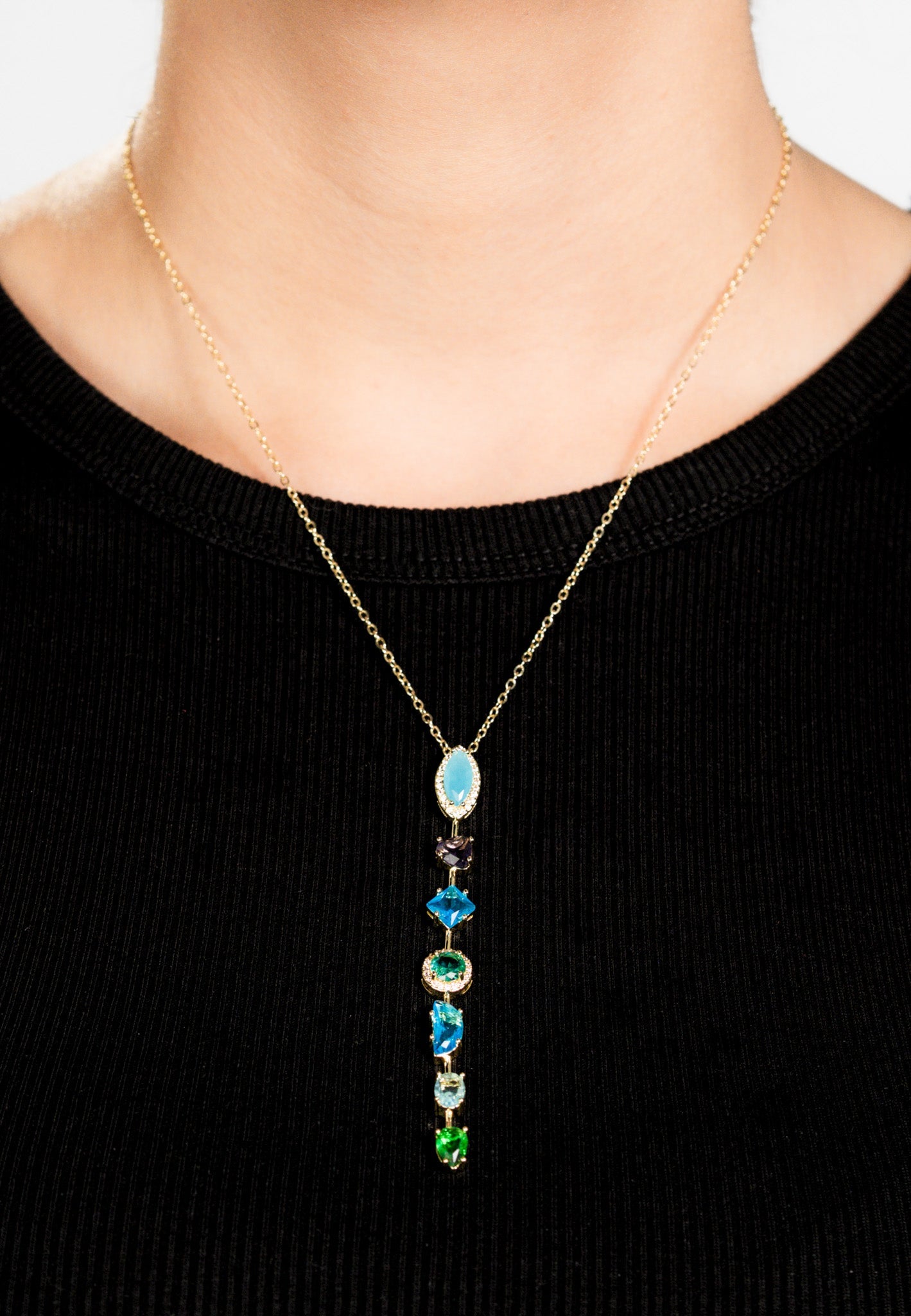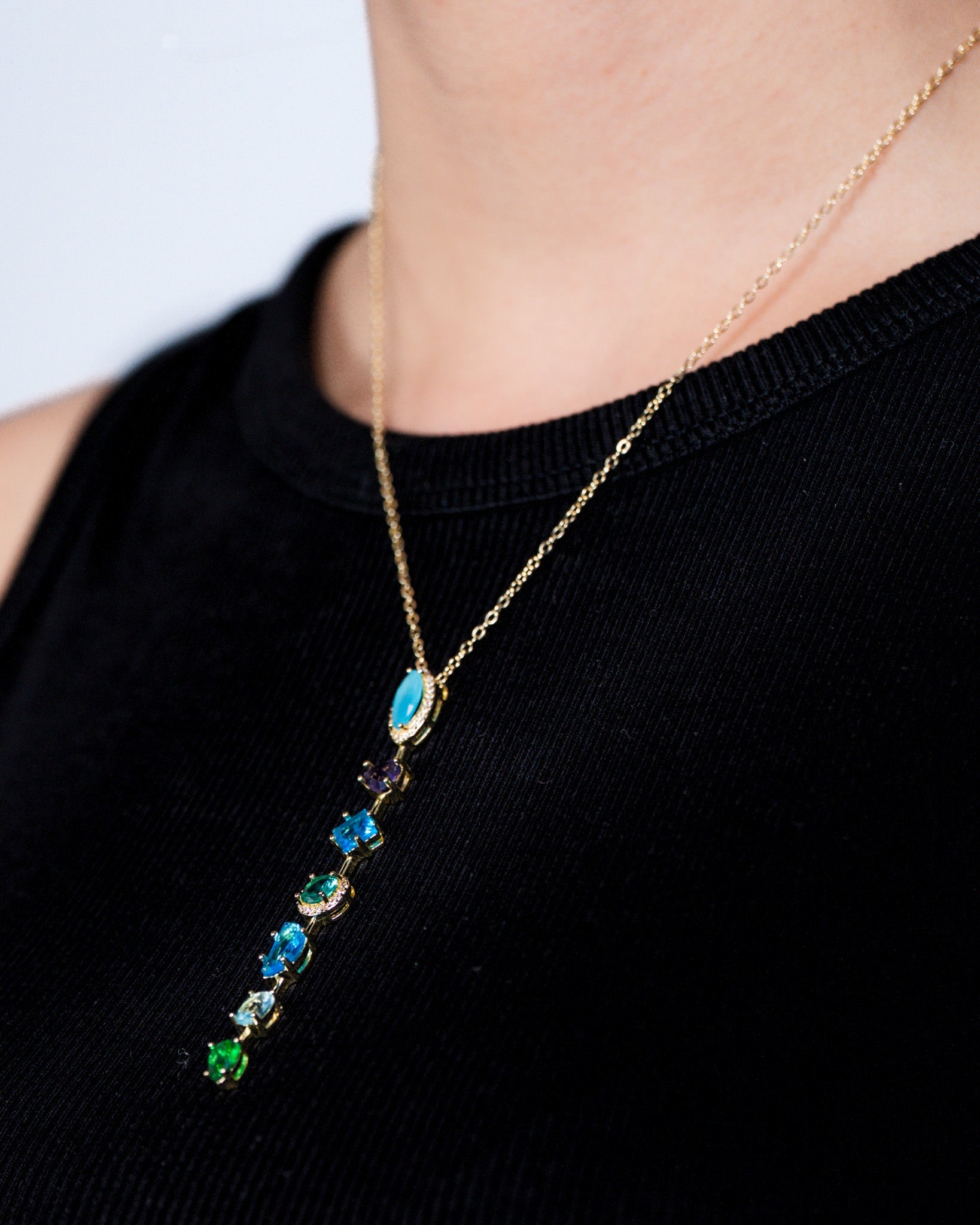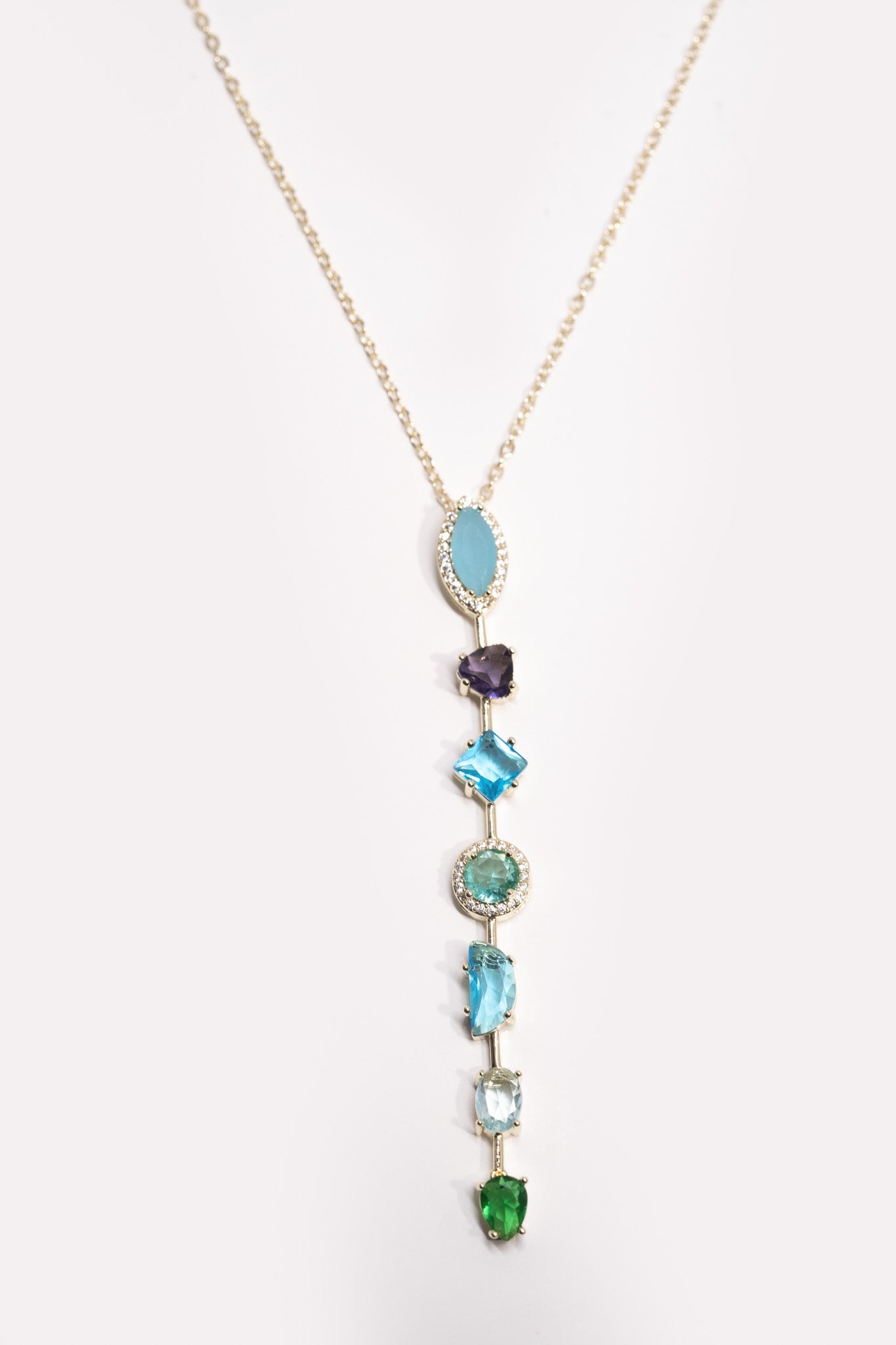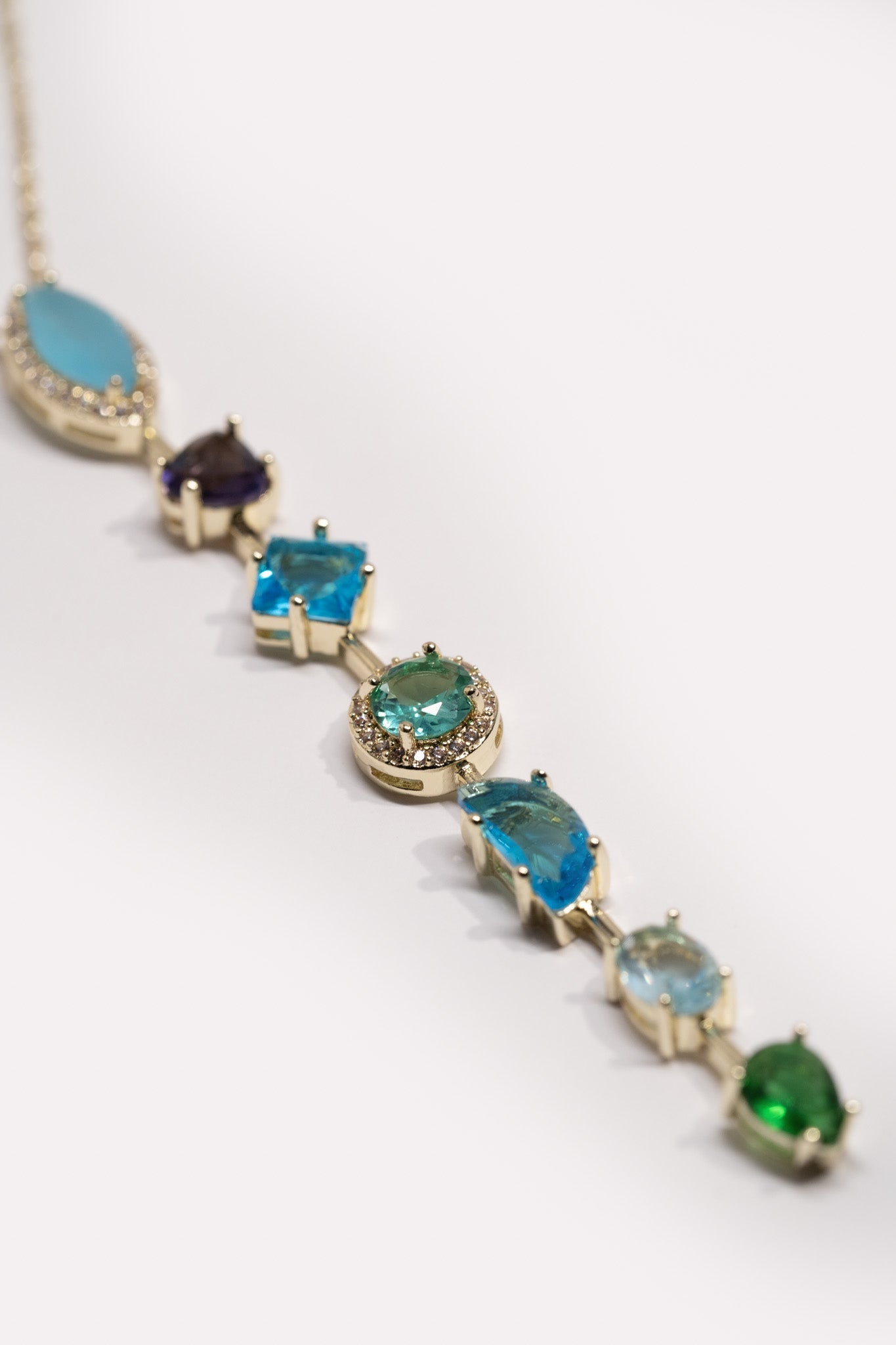 Mg Blue Stone Necklace is a special design that offers a captivating blend of elegance and color harmony. Featuring a vertical arrangement of blue stones in various cuts and shades, this necklace delivers both a graceful and eye-catching look. Its delicate gold-toned chain perfectly complements the striking beauty of the stones.