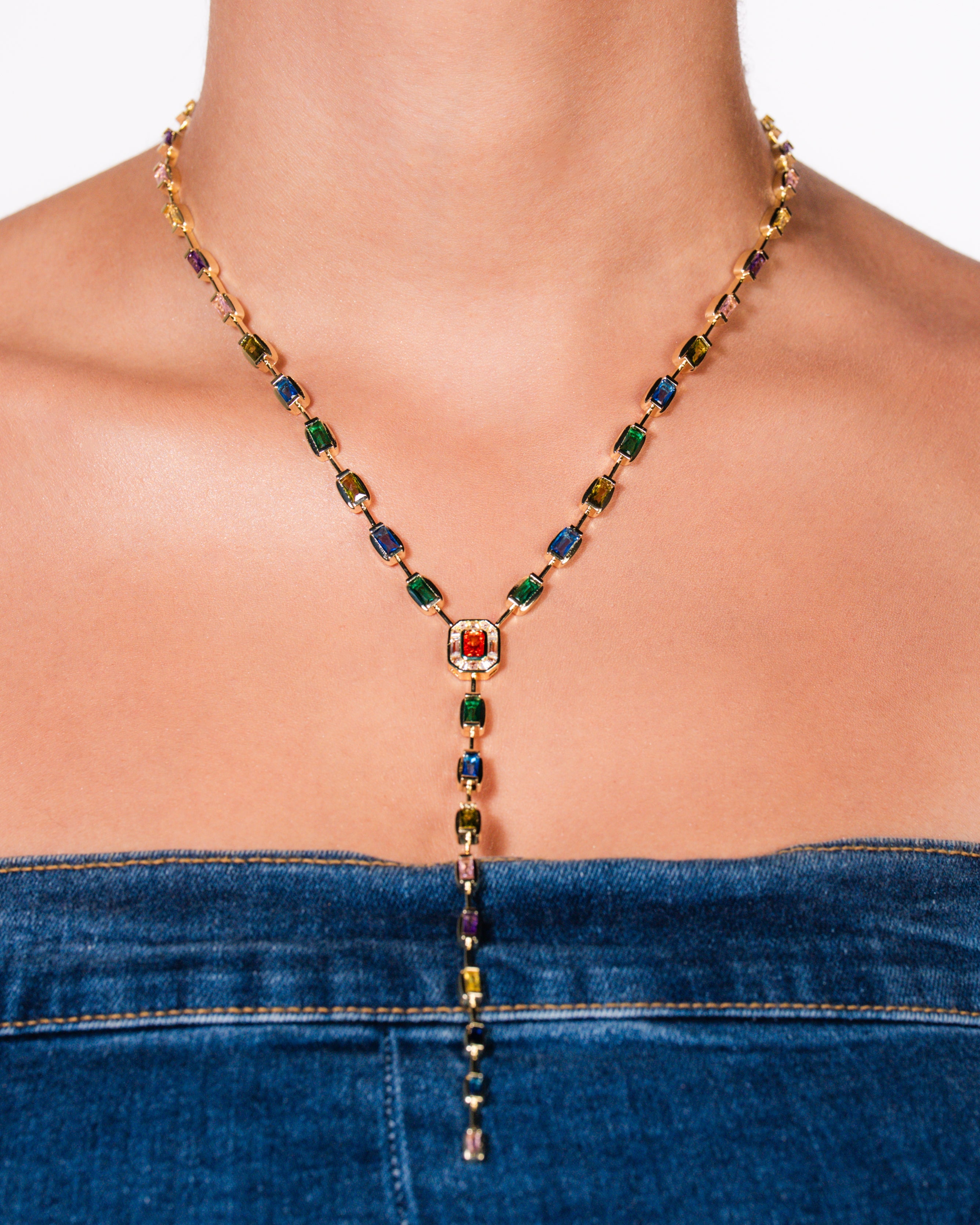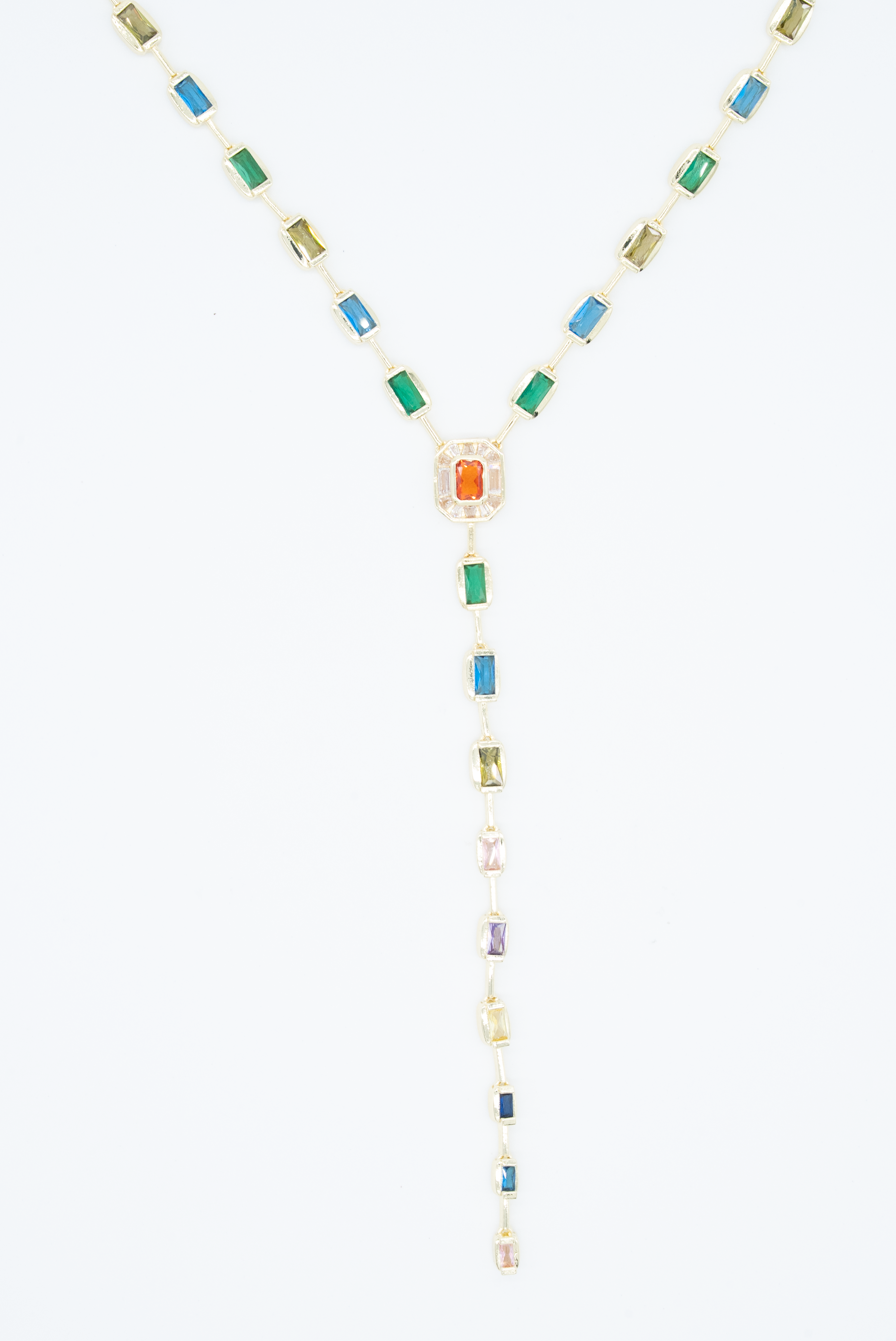 Mg Deluxe Necklace is a dazzling accessory that combines elegant design with the mesmerizing harmony of colorful stones. The arrangement of multi-colored, finely cut stones gives the necklace both a modern and luxurious look. The vibrant orange stone at the center stands out as the focal point of the design.