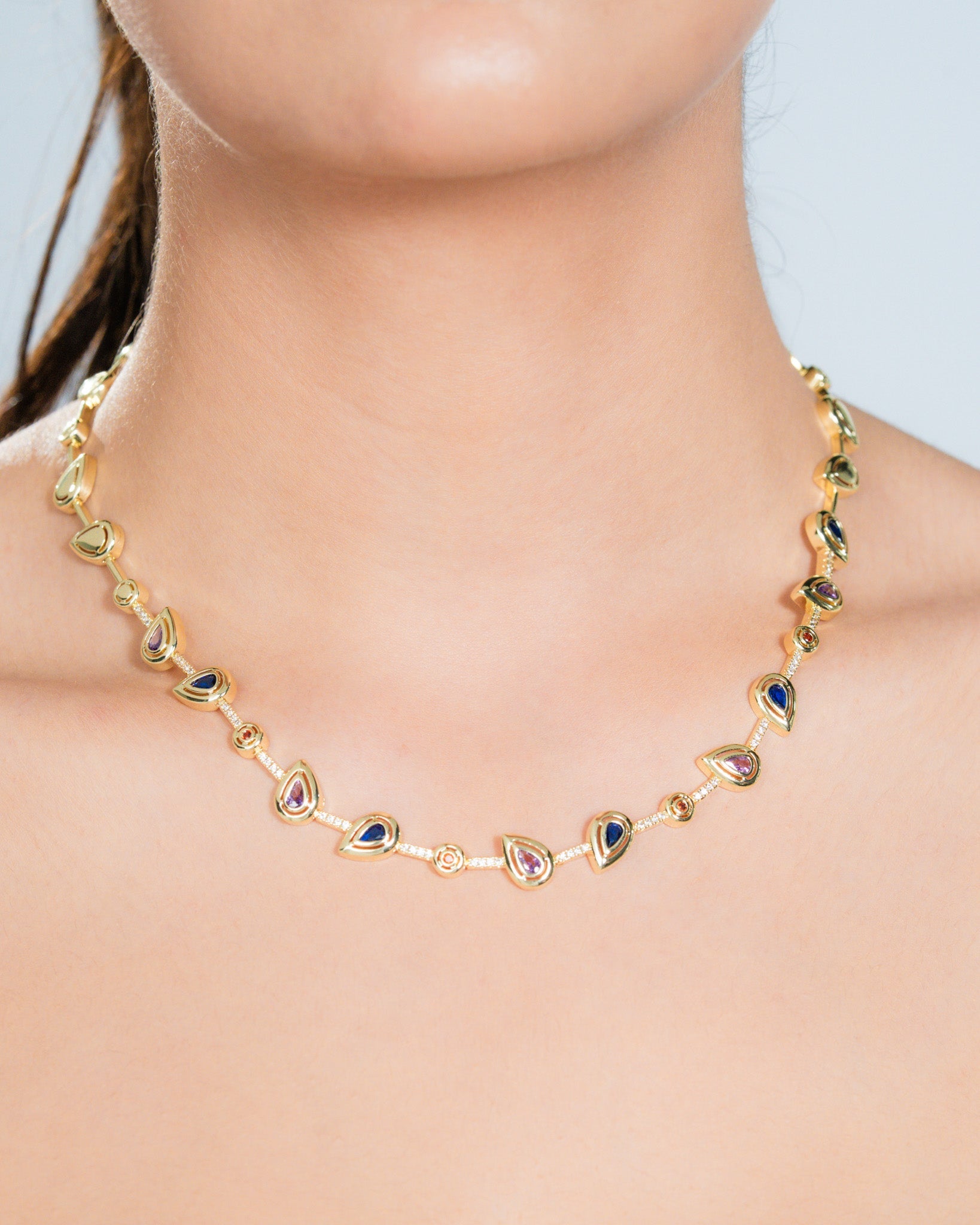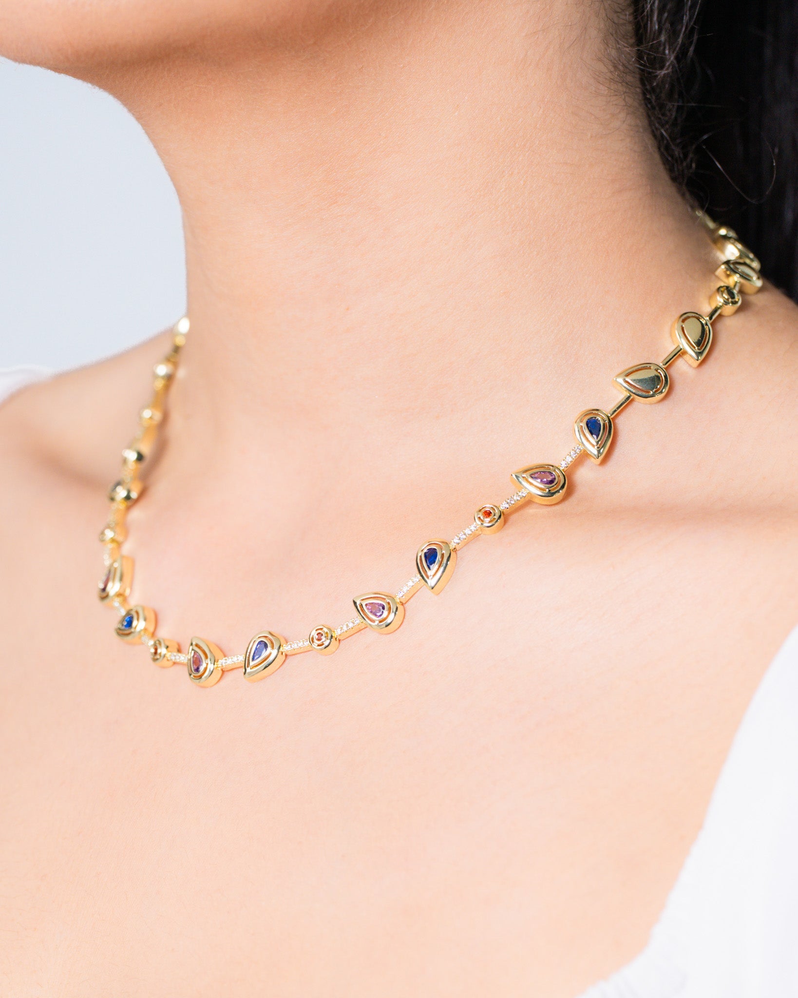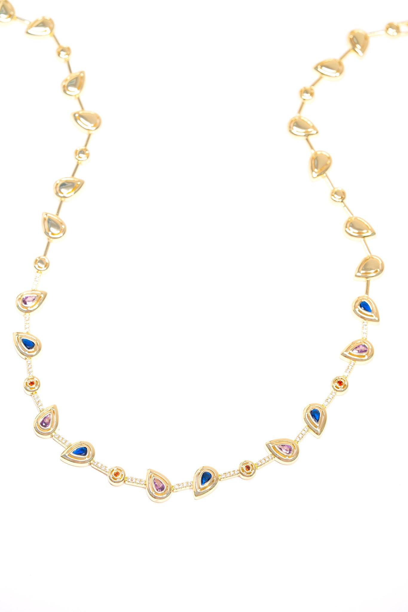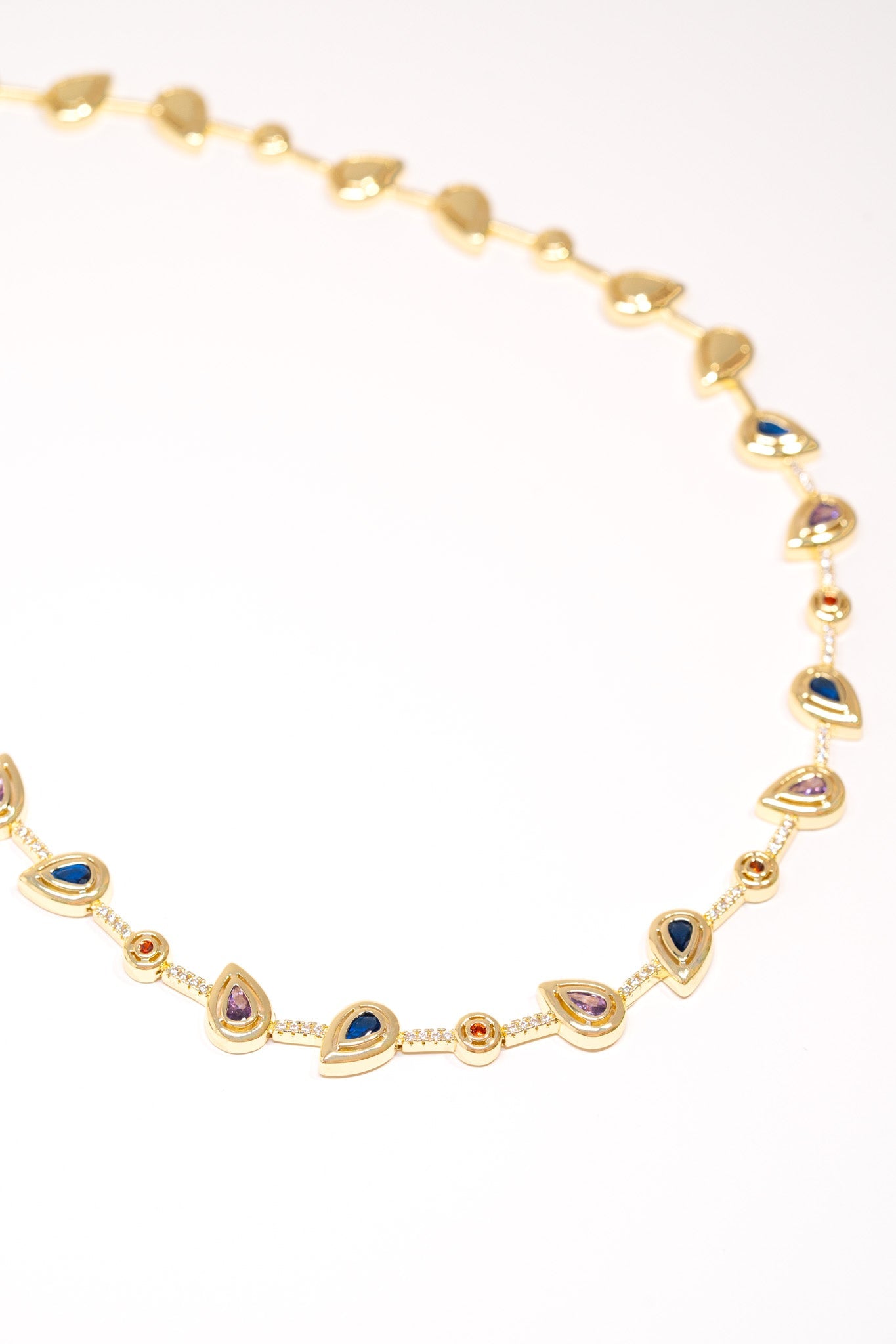 Mg Fresh Necklace blends elegance with a playful aesthetic through its vibrant and energetic design. The delicately arranged drop-shaped blue, purple, and red stones on a gold-toned chain offer a look that is both eye-catching and subtly chic. Its lightweight structure ensures comfortable wear, while the colorful stones add a lively touch to any outfit.
