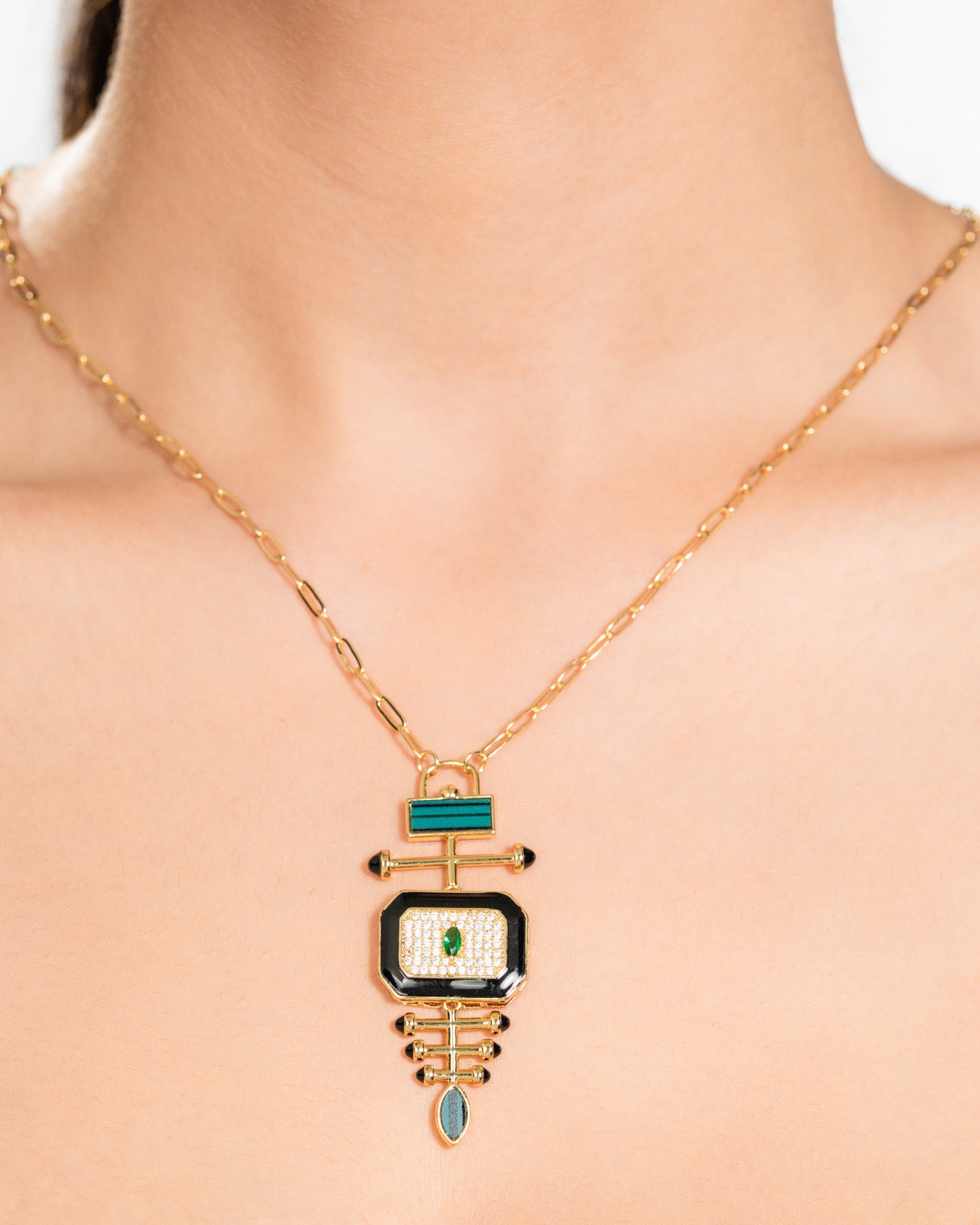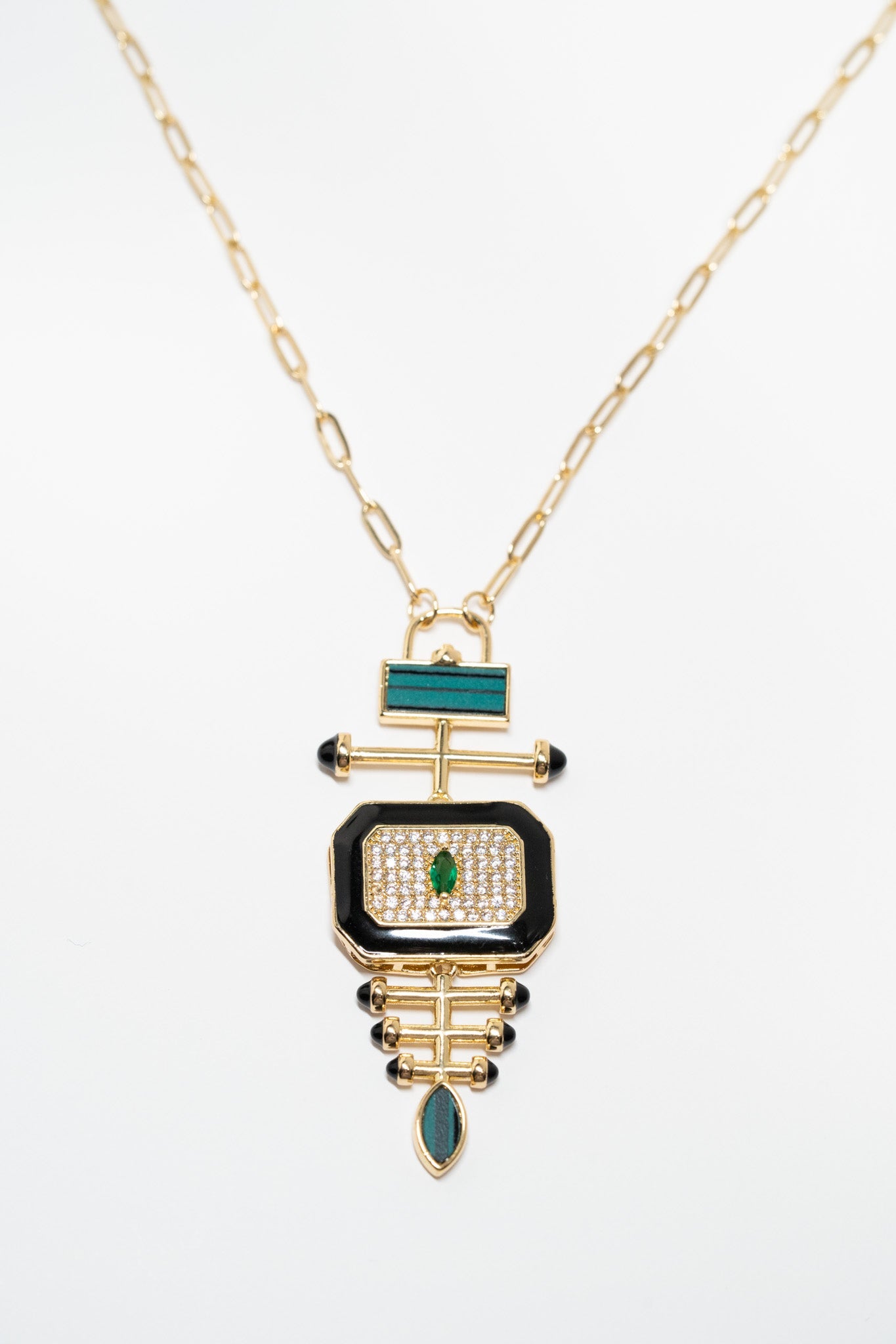 Mg Xl Necklace accompanies bold and sophisticated styles with its statement-making, artistic design. Featuring a gold-toned chain and a large pendant with a striking black and emerald green contrast, it delivers elegance that captures attention at every glance. Its geometric lines and emerald-colored centerpiece create a truly distinctive character.