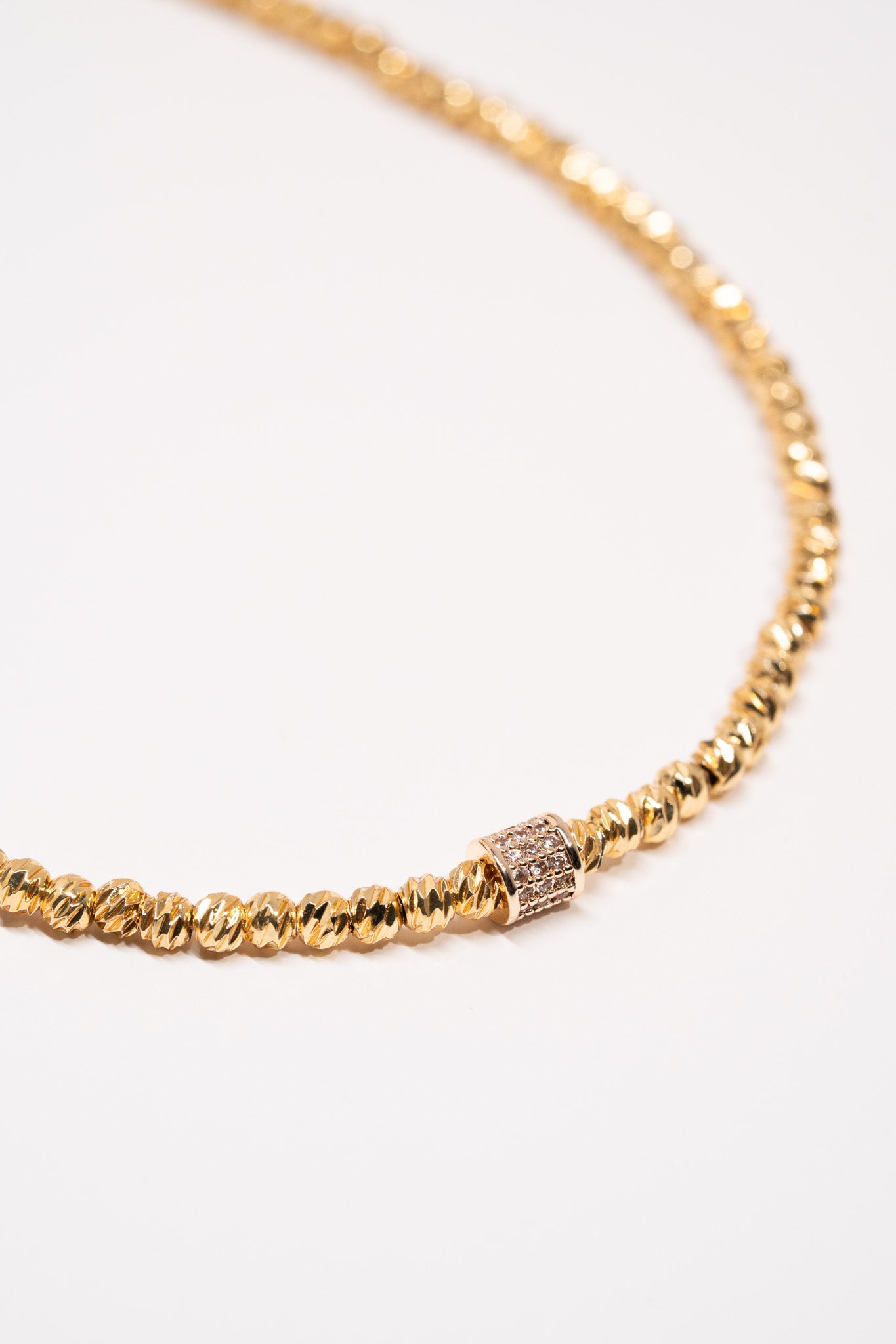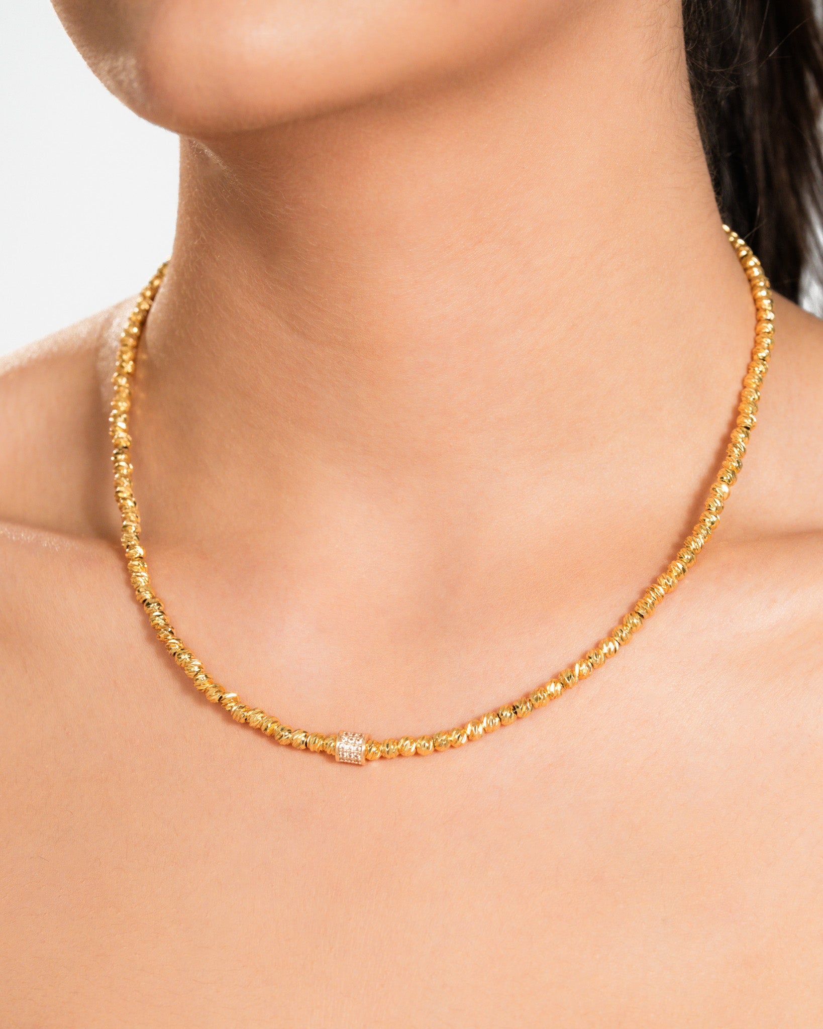 Mini Stone Gold Dorika blends the classic dorika bead arrangement with a modern sparkle, adding a radiant touch to minimalist elegance. Its thin and delicate gold-toned structure is accented by a central stone-embellished cylindrical detail, creating a feminine and refined look. Perfect for everyday wear, yet elegant enough for special occasions.
