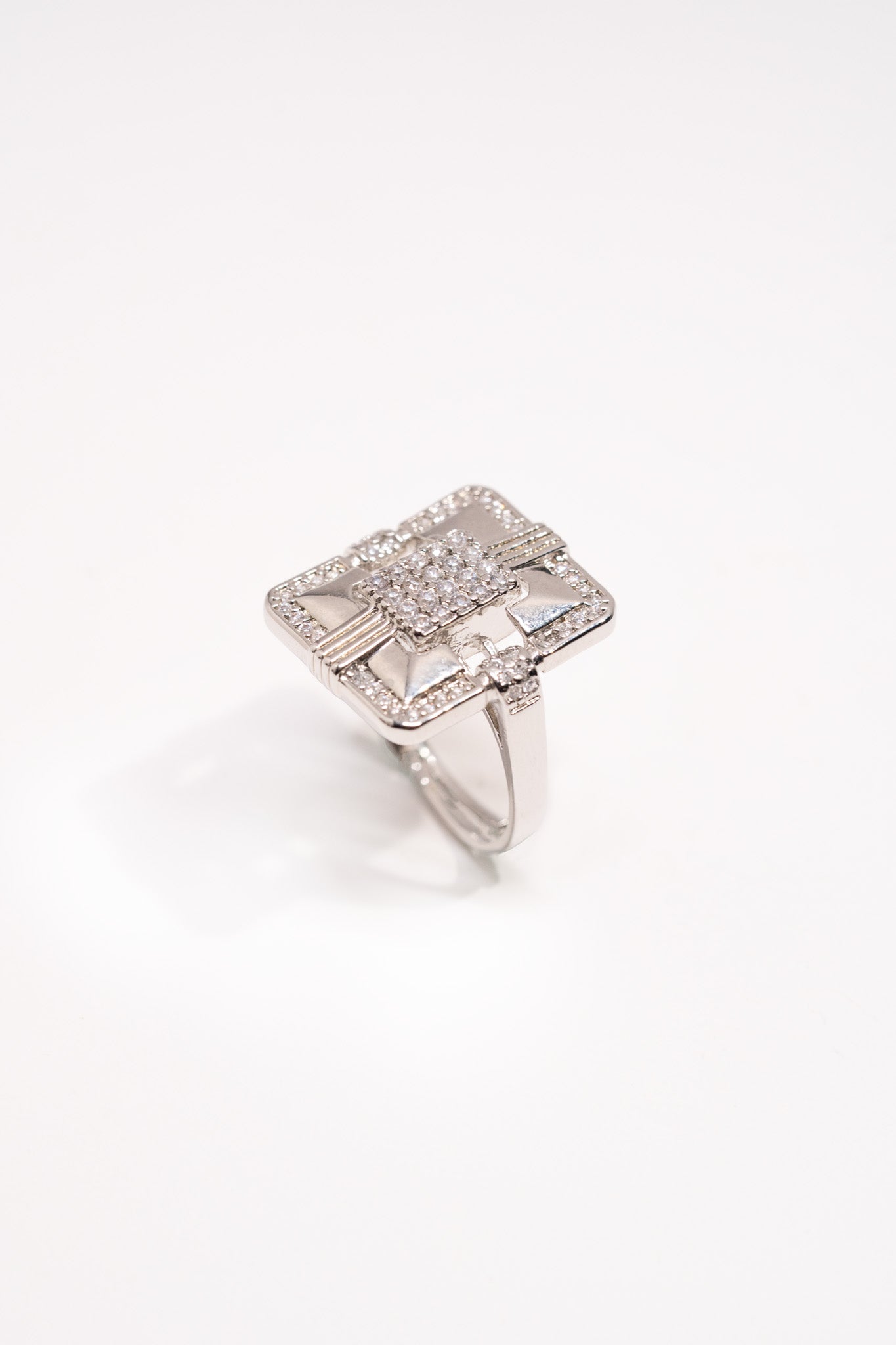Rectangular Stone Ring elevates your style with a striking design that blends elegance and glamour. Featuring geometric lines and a symmetrical arrangement of stones, this ring is enriched with sparkling rectangular-cut zircon stones concentrated at the center. Tiny stones surrounding the frame add depth and a luxurious touch to the design.