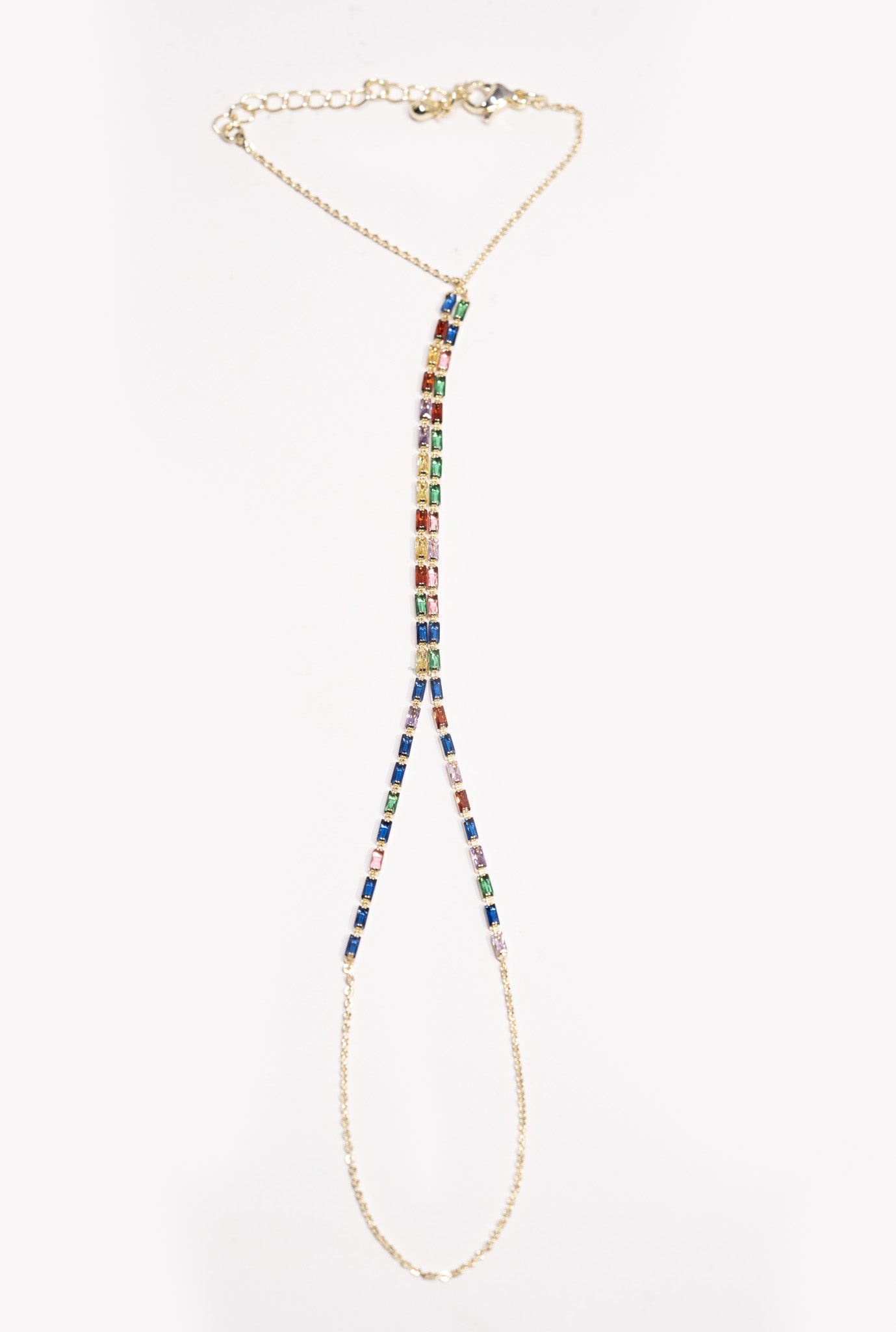 Rainbow Gold Hand Chain transforms your wrist into a true work of art with its colorful stone arrangement and golden chain detail. With its elegant design, it adds a splash of color to your daily outfits and completes your look at special events. Designed with modern lines, this hand chain brings a touch of rainbow sparkle to your style.