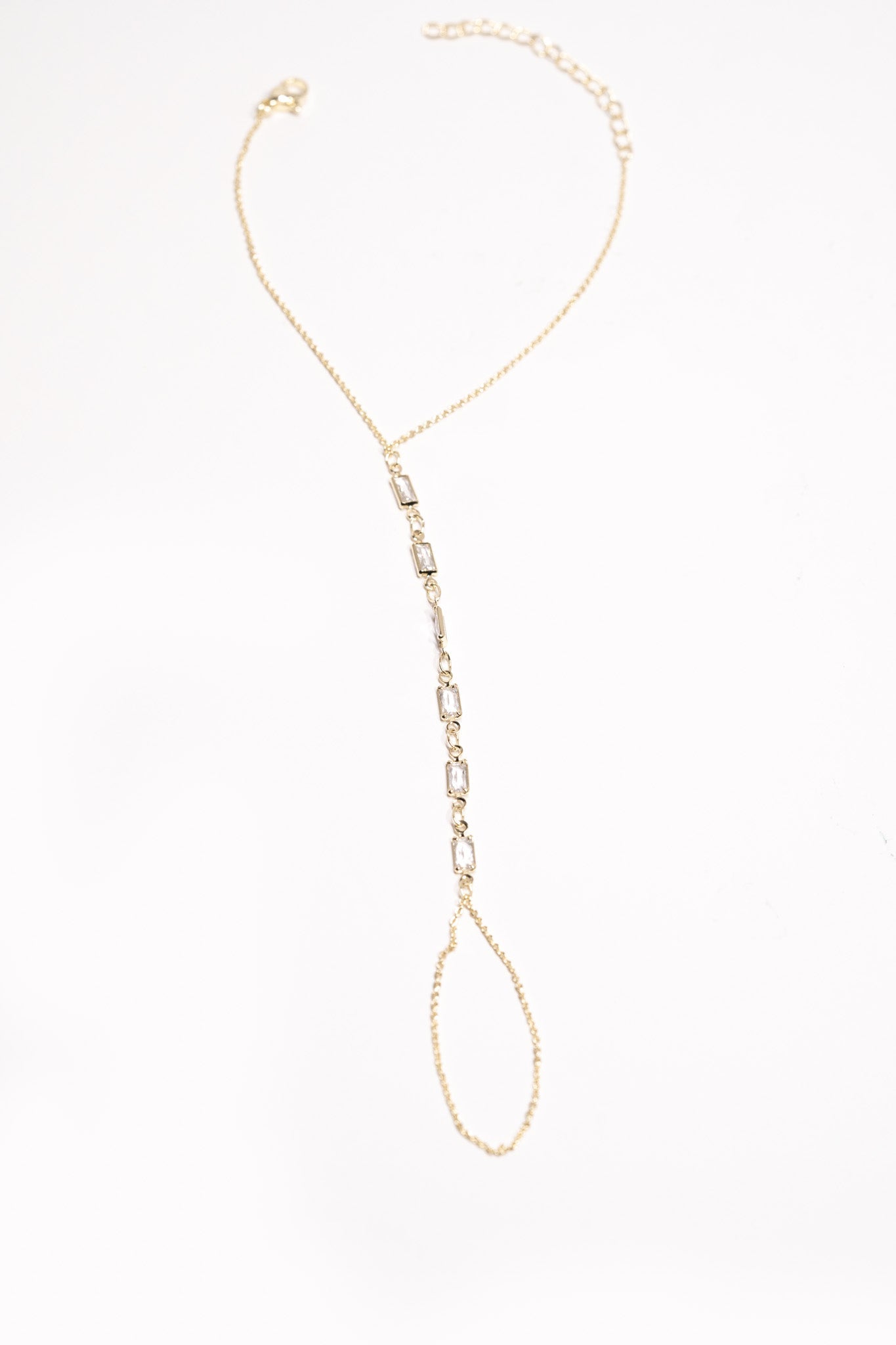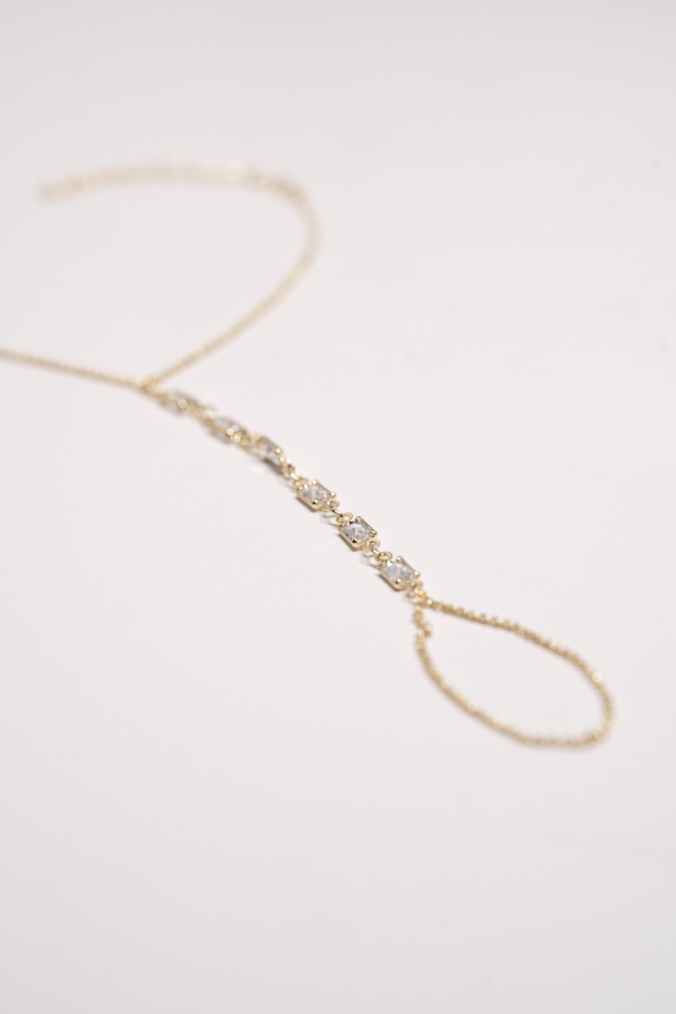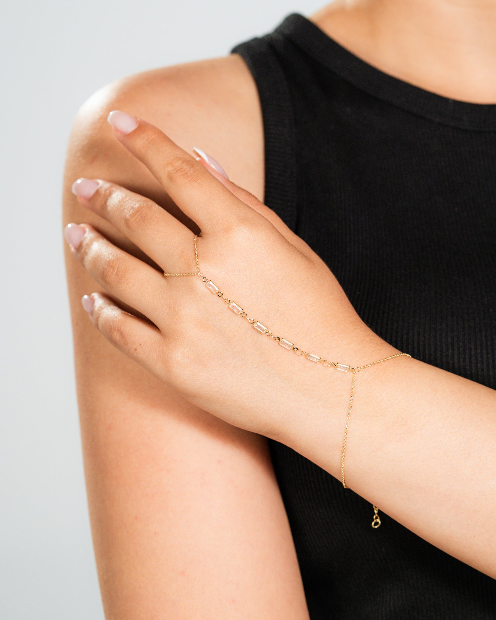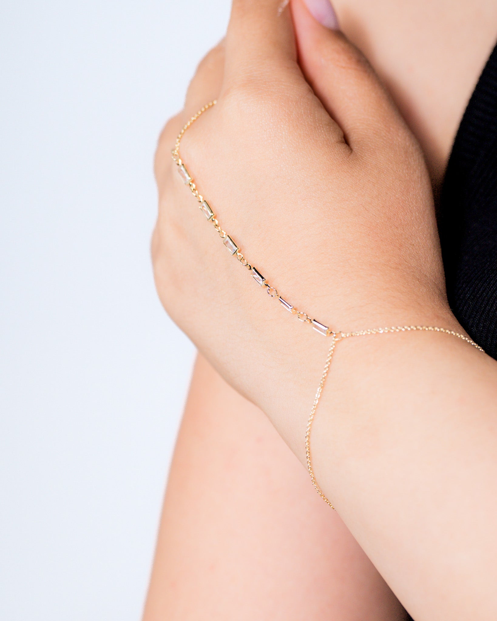 Six-Stone Gold Hand Chain is a modern reinterpretation of the traditional hand accessory, blending elegance with minimalist sophistication. Its delicate chain and six sequential rectangular-cut zircon stones create a light yet striking look on the hand. This piece merges the timeless charm of the classic hand chain (Shahmaran) with contemporary design, making it suitable for both everyday wear and special occasions.