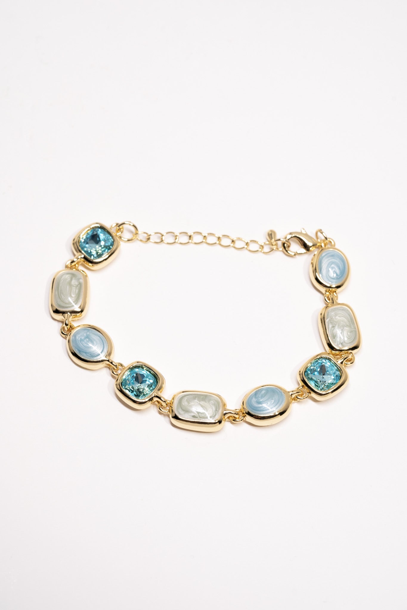 Aquamarine Bracelet brings a serene elegance to your wrist with a design inspired by the cool blues of nature. Housed in gold-plated frames, the water-toned natural stones and delicate blue zircon details combine tranquility and sophistication. The smooth transitions between oval and angular shapes offer a modern and aesthetic touch.