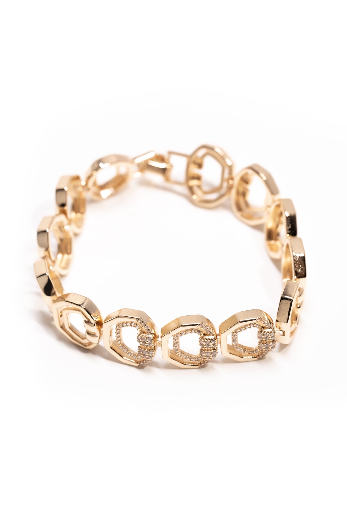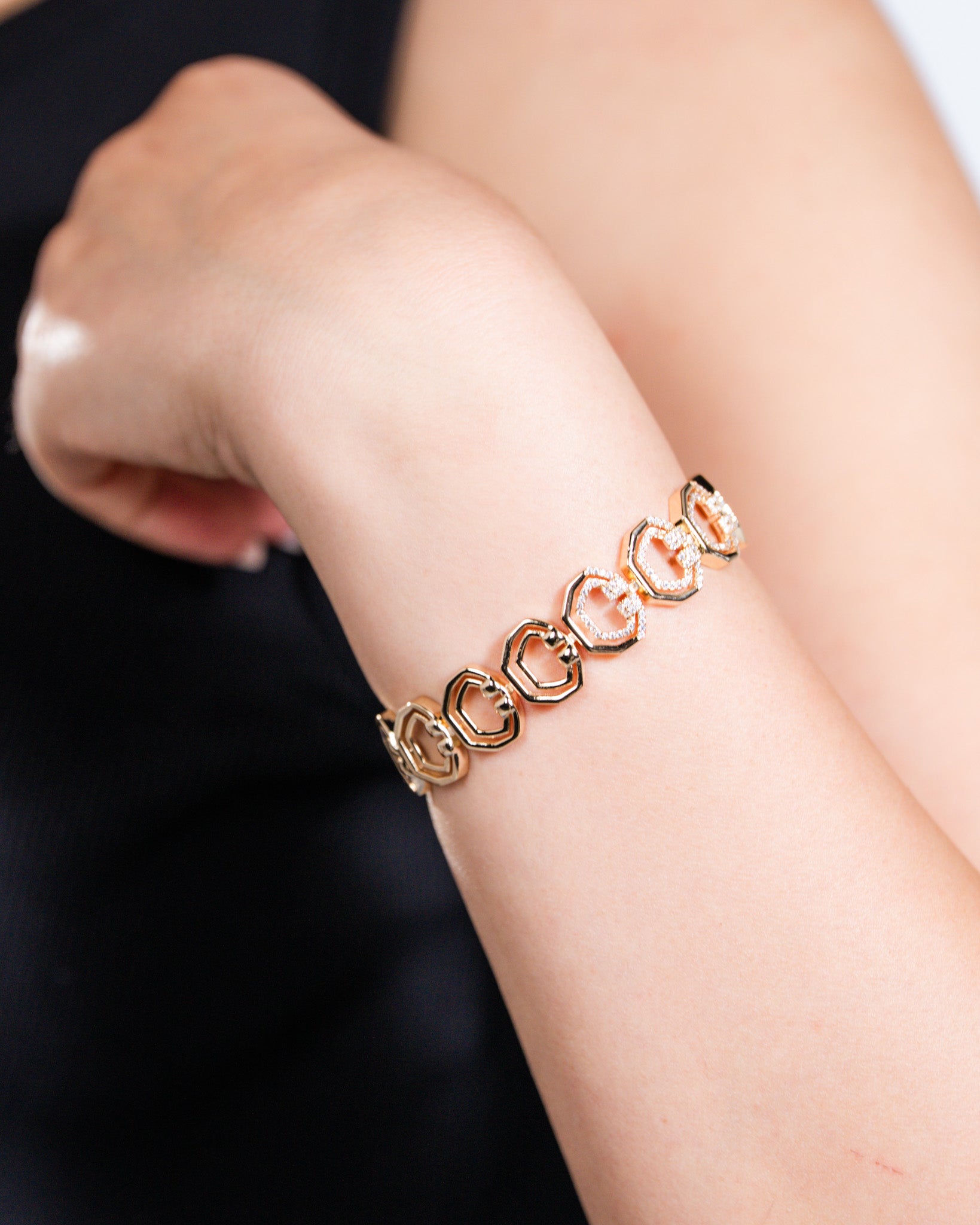 C Stone Bracelet is a modern design where geometric forms meet elegant stone details. The C-shaped links placed on a gold-plated surface are adorned with sparkling white zircon stones, creating a striking shine on your wrist. With its bold yet refined lines, it adds sophistication to both your everyday style and special moments.